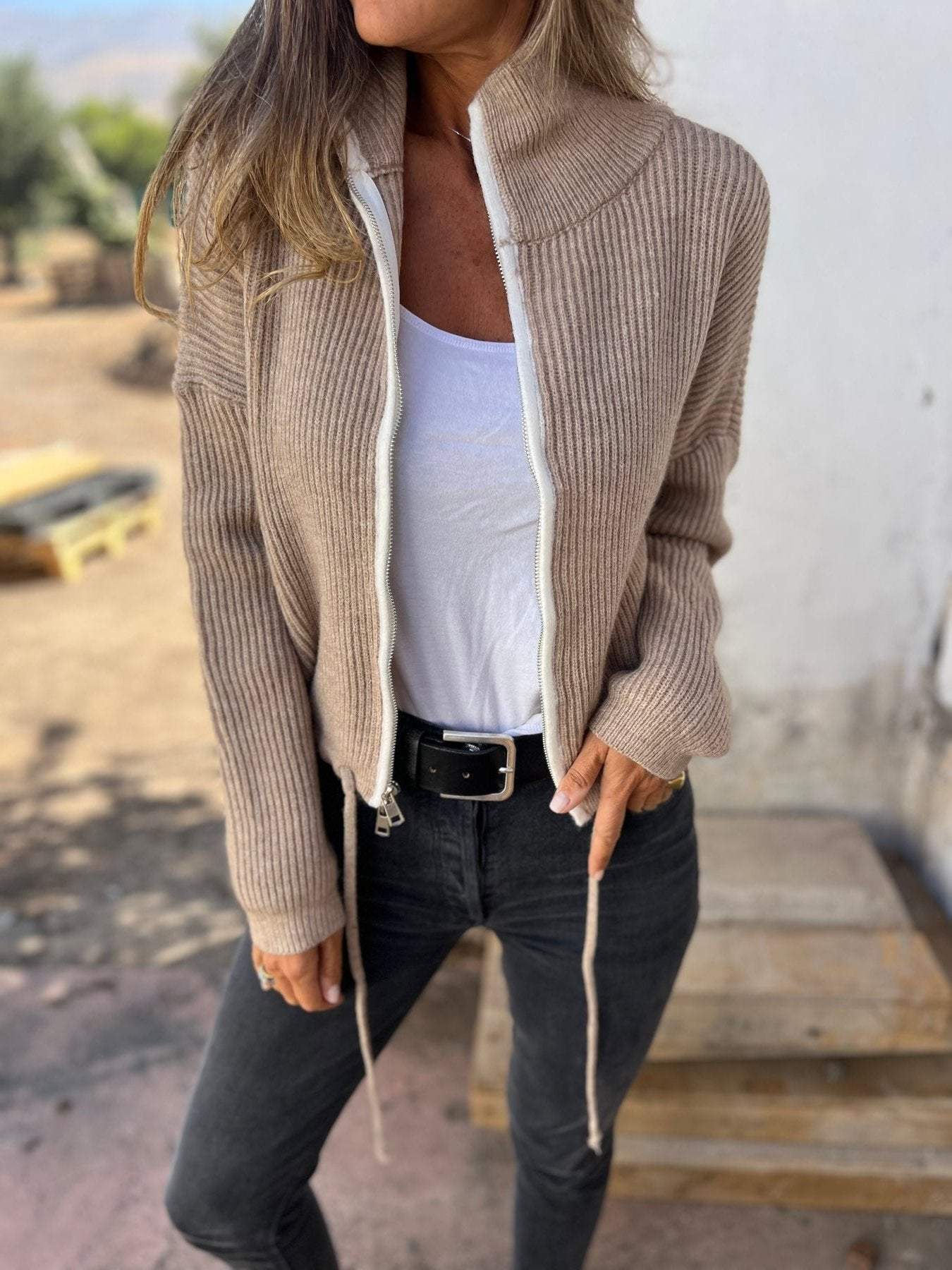 Crew Neck Knitted Casual Long-sleeved Cardigan with Zipper