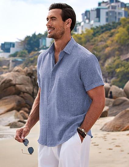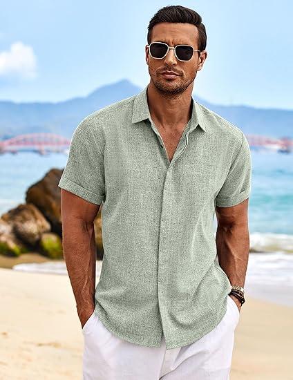 Mens Linen Shirts comes with button-down closure, short sleeve, adjustable cuff, slim fit, solid color. Casual Beach Style Design to make you feel better about this summer.